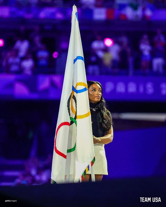 Simone Biles a primit drapelul olimpic, duminică seară, la Paris, în cadrul ceremoniei de închidee a Jocurilor Olimpice.