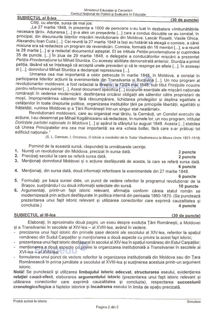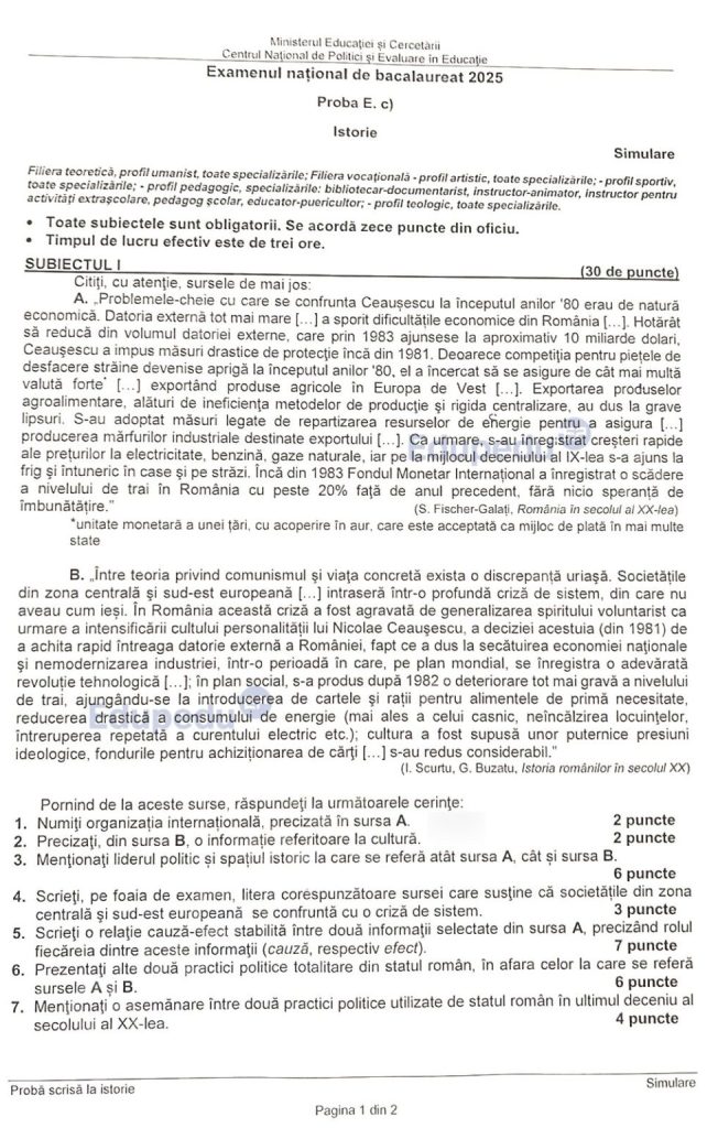 Subiecte la Istorie la Simulare BAC 2025