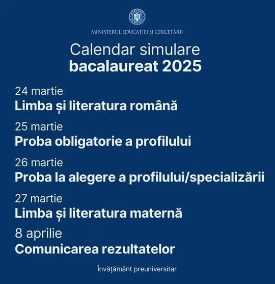 Simularea probelor scrise din cadrul examenelor naţionale pentru elevi (an şcolar 2024 – 2025), organizată la nivelul întregii ţări de către Ministerul Educaţiei şi Cercetării, programează, în intervalul 24 – 27 martie, următoarele teste aferente examenului naţional de bacalaureat:
