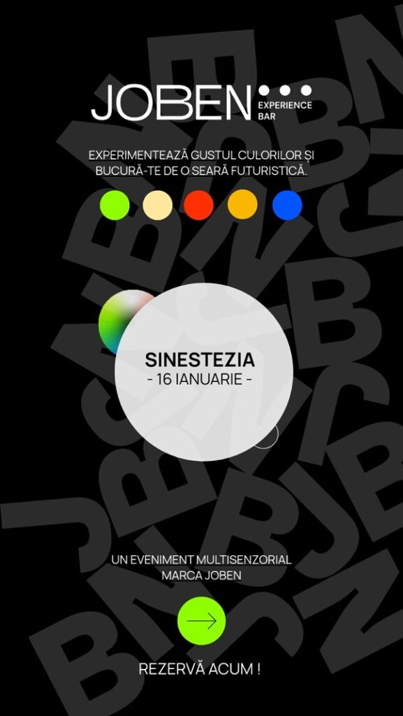 În fiecare joi seara, Joben te invită într-o lume unde simțurile se împletesc armonios. Sinestezia nu este doar o cină, ci o experiență care te poartă printr-o poveste fascinantă a culorilor, sunetelor și aromelor. Ceva extraordinar te așteaptă – un spectacol care transformă fiecare farfurie într-o operă de artă, fiecare băutură într-un elixir, și fiecare moment într-o amintire memorabilă.