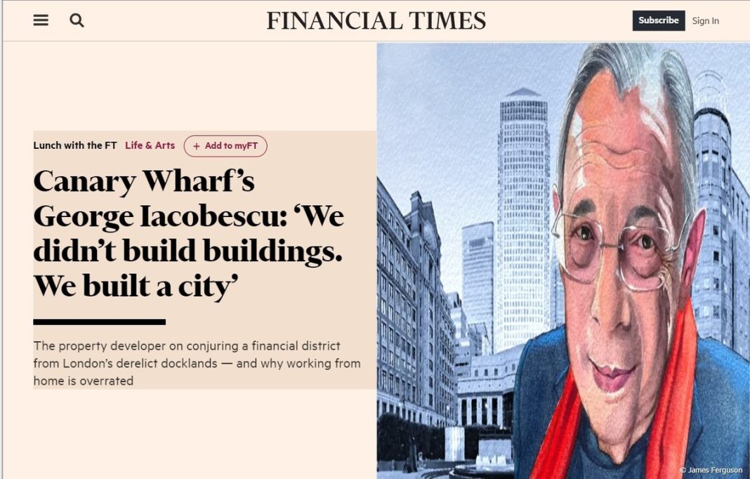 Sir George Iacobescu a crescut în România comunistă în deceniile de după cel de-al Doilea Război Mondial, dar astăzi este un dezvoltator imobiliar extrem de respectat în Marea Britanie, fiind preşedintele Canary Wharf Group, firma care a transformat o zonă de docuri abandonate în cartierul financiar al Londrei. Într-un interviu-reportaj publicat de Financial Times, George Iacobescu a povestit despre viaţa sa, mărturisind că uneori trebuie să se ciupească pentru a se convinge că nu visează.