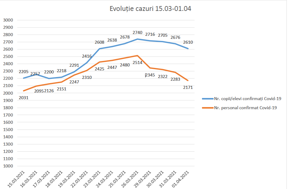 Astfel, numărul a crescut de pe 15 martie, de la 2205, respectiv 2031 cazuri până pe 26 martie, când a ajuns la un vârf de 2740 de cazuri de elevi și 2514 angajați, apoi a început să scadă, iar pe 1 aprilie a ajuns la 2610, respectiv 2171 cazuri de infectări.