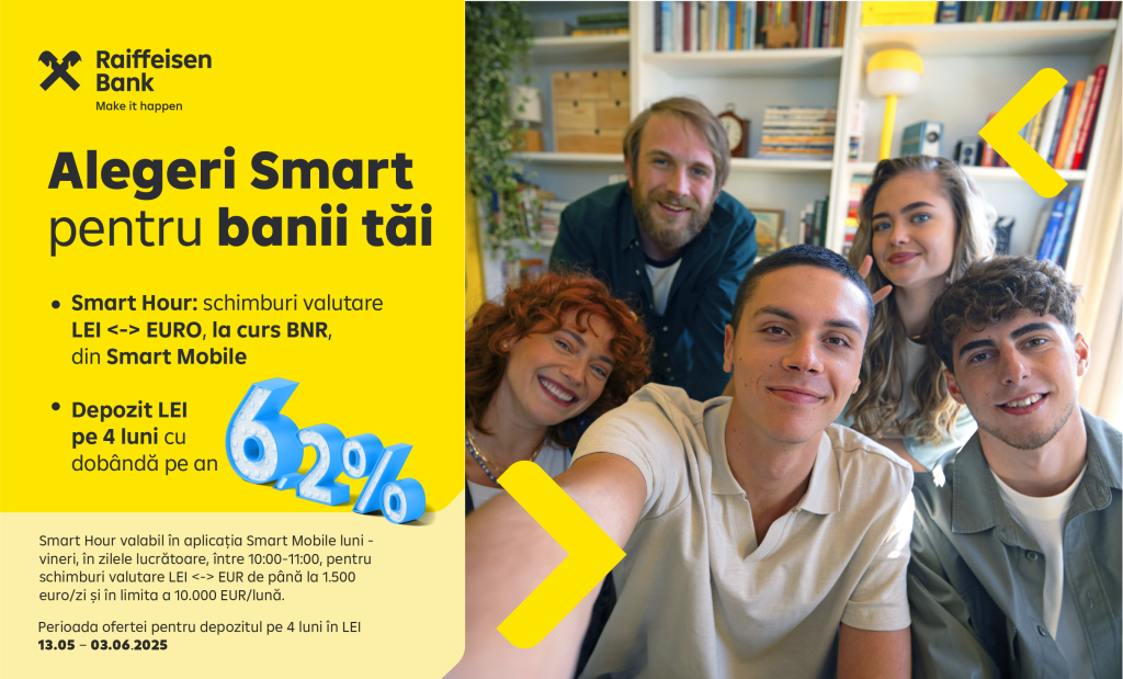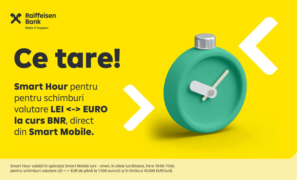 Totodată, Raiffeisen Bank oferă clienților Smart Hour, de luni până vineri, în zilele lucrătoare, între 10:00 – 11:00, pentru schimburi valutare lei-euro, euro-lei la curs BNR direct din Smart Mobile și acces la un curs de schimb valutar dinamic, actualizat în timp real în aplicația de mobile banking, astfel încât clienții să poată beneficia cu ușurință de cele mai bune oportunități din piață. Prin această inițiativă, Raiffeisen Bank își propune să ajute clienții în luarea celor mai bune decizii de economisire, indiferent de valuta sau termenul ales, având la dispoziție cu ușurință toate instrumentele necesare în acest sens.