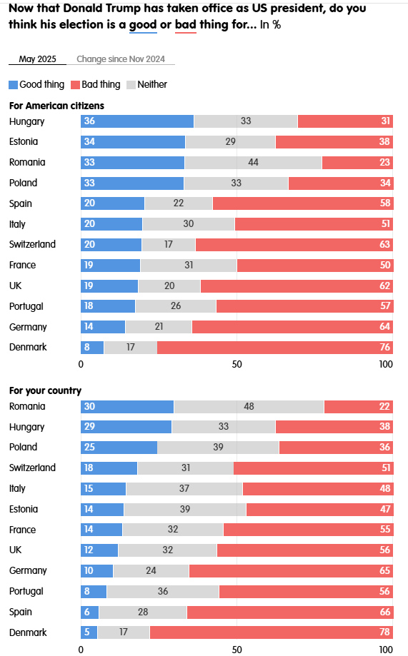 Acest lucru poate fi observat mai ales în Danemarca, acolo unde 86% dintre respondenți cred că sistemul politic american este „defectuos” și unde procentul populației care consideră realegerea lui Trump un lucru rău pentru cetățenii americani a crescut de la 54% la 76% în doar șase luni.