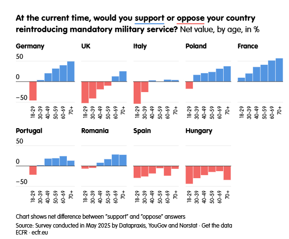 Cu toate acestea, procentul scade vertiginos la cel mai tânăr grup demografic (18-29 de ani). În medie, doar 27% dintre respondenții acestui grup, care au vârsta necesară pentru înrolare, și-a exprimat susținerea, majoritatea (57%) răspunzând că se opun unei astfel de inițiative.