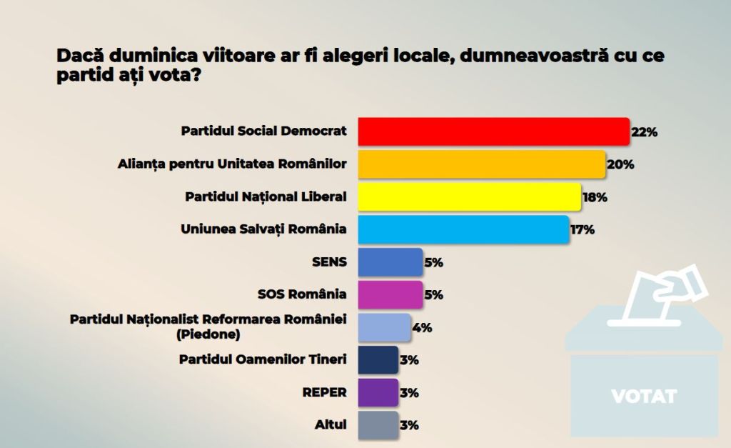 În ipoteza organizării unor alegeri locale duminica viitoare, Partidul Social Democrat ar obține 22% din voturile bucureștenilor, fiind urmat de Alianța pentru Unitatea Românilor, cu 20%. Partidul Național Liberal este cotat cu 18%, iar Uniunea Salvați România cu 17%.
