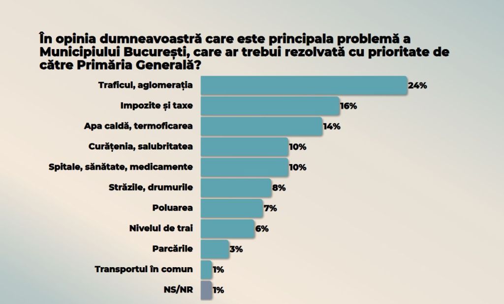 Întrebați care este principala problemă ce ar trebui rezolvată cu prioritate de Primăria Generală, bucureștenii indică în primul rând traficul și aglomerația, menționate de 24% dintre respondenți.