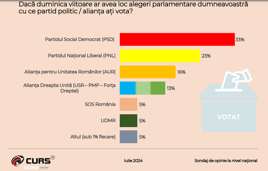 Pentru alegerile parlamentare, PSD conduce în intenţia de vot cu 33%, urmat de PNL cu 23%, în timp ce diferenţa dintre AUR şi Dreapta Unită este de 3 procente, arată același sondaj CURS.