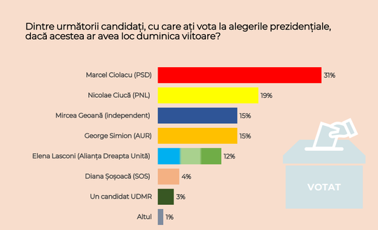 Liderul PSD, Marcel Ciolacu, este cotat cu 31% în intențiile de vot pentru alagerile prezidențiale, urmat de Nicolae Ciucă, cu 19%, în timp Mircea Geoană şi George Simion sunt la egalitate cu 15%, într-un sondaj realizat de CURS în luna iulie.