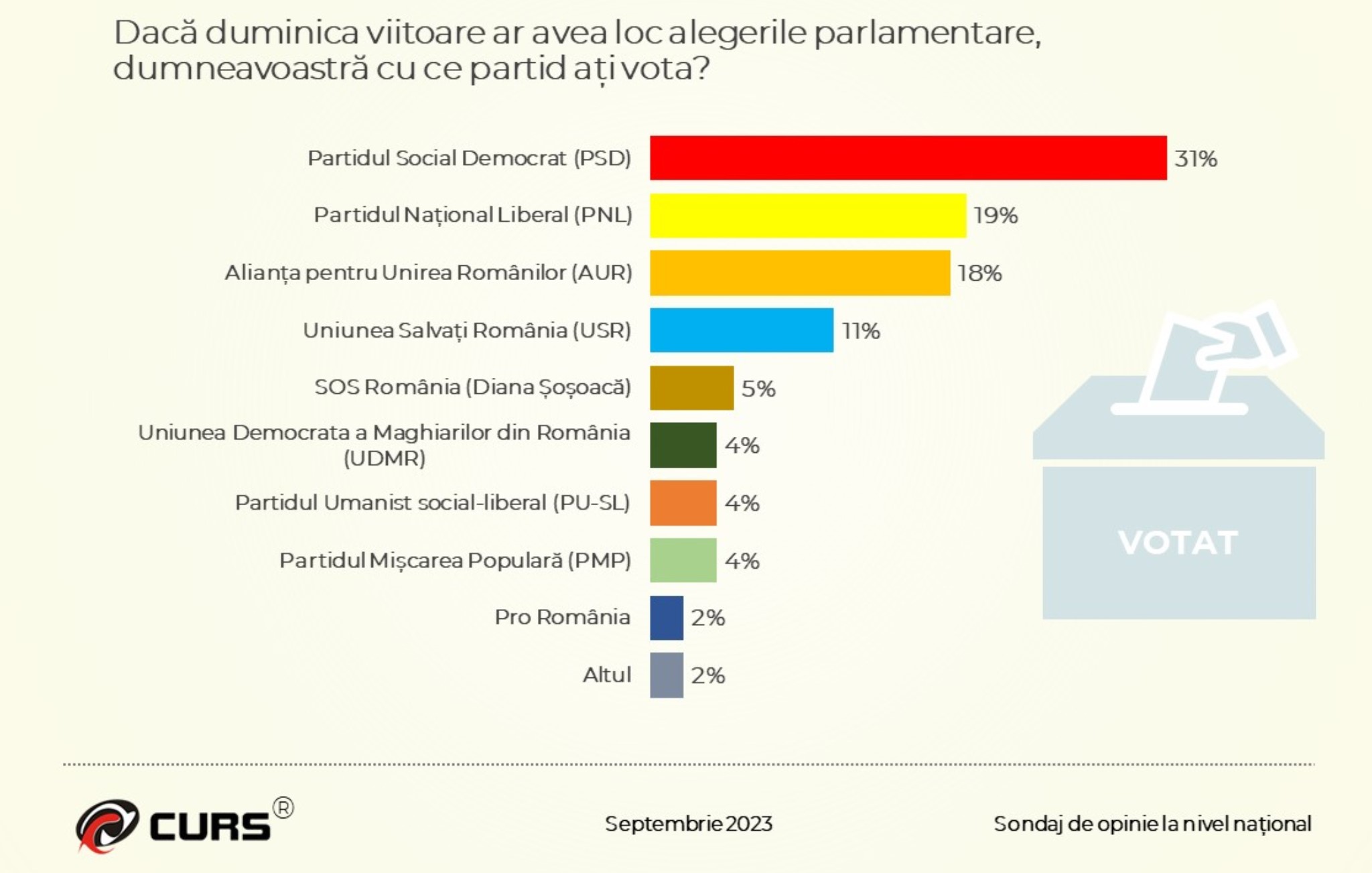 Potrivit sondajului CURS, PSD este creditat cu 31%. Pe locul doi este PNL, cu 19%, urmat imediat de AUR, cu 18%.