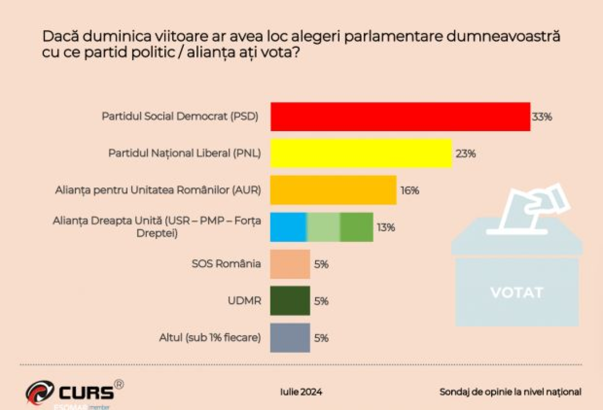 Conform sondajului CURS, PSD domină scena politică cu 33%, în timp ce PNL ar obține 23%. Aceste cifre ne arată că românii creditează cu încredere actuala coaliție și, în noul Parlament, PSD și PNL ar putea obține o majoritate confortabilă.
