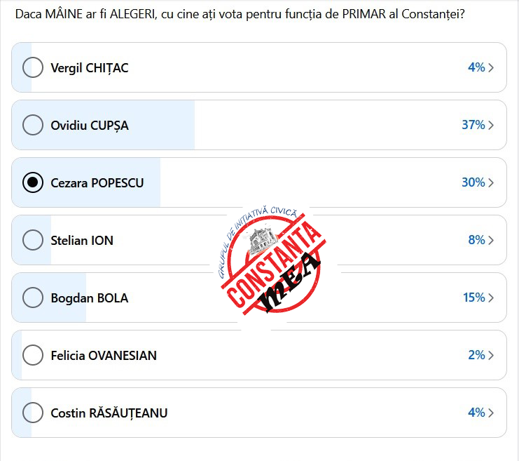 1. Ovidiu Cupsa (Partidul AUR): 37% – Cu un sprijin semnificativ, Ovidiu Cupsa se află pe prima poziție în preferințele respondenților, reflectând popularitatea partidului AUR în zona Constanța dar și mobilizarea exemplară a membrilor filialei locale a acestui partid condus de George Simion.