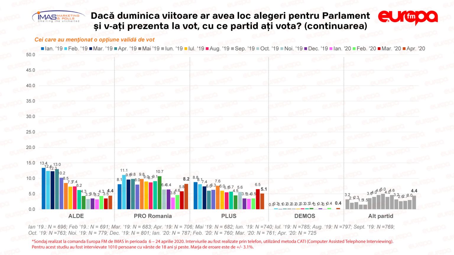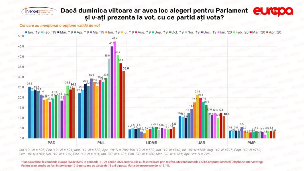 Sondajul a fost realizat de IMAS la comanda Europa FM în perioada 6 – 24 aprilie, pe un eşantion de 1010 persoane şi are o marjă de eroare de 3,1%.