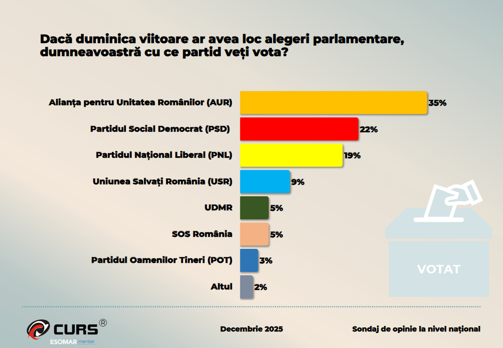 Dacă duminica viitoare ar avea loc alegeri parlamentare, AUR ar obține 35% din voturi, devenind detașat primul partid. PSD ar urma cu 22%, PNL cu 19%, iar USR cu doar 9%.
