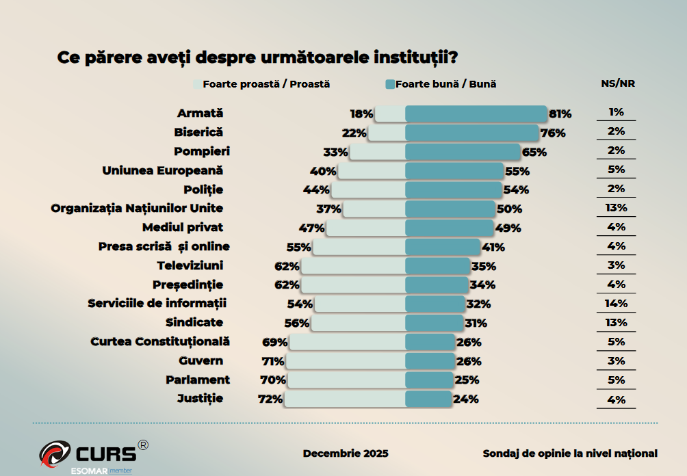 Sondajul scoate la iveală un contrast puternic între instituțiile percepute ca „funcționale” și cele asociate cu politica.