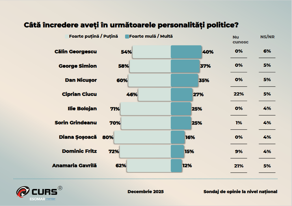 Nici scena politică nu oferă repere solide de încredere. Pentru majoritatea liderilor politici testați, scorurile de încredere ridicată sunt modeste, iar zonele de neîncredere domină clar.