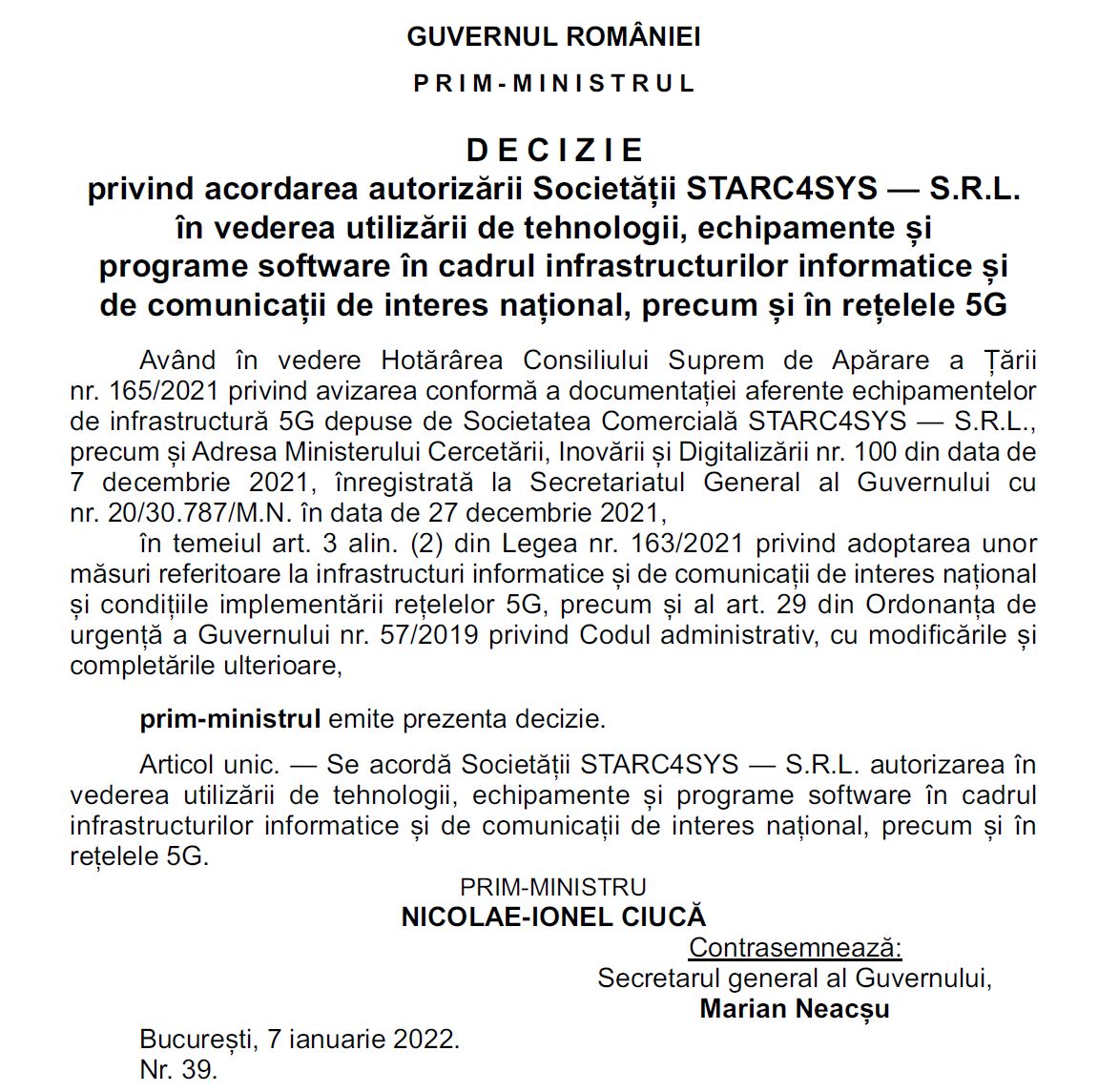 Hotărârea CSAT privind avizarea conformă a documentației aferente echipamentelor de infrastructură 5G depuse de firma Starc4Sys a avut loc în luna decembrie a anului trecut.