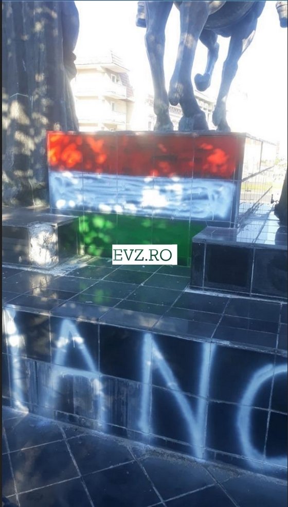 Pe o parte a statuii, acești localnici au reprodus steagul Ungariei, iar la picioarele statuii a fost scris ”Trianon 1920”, potrivit evz.ro.
