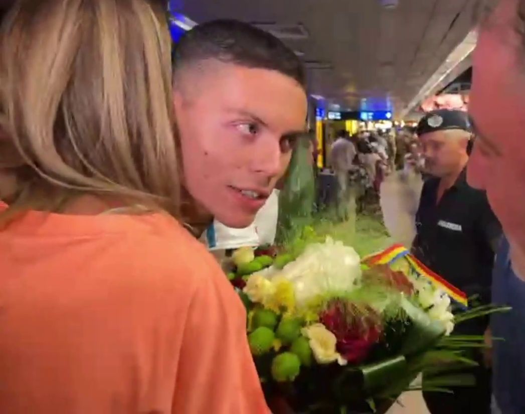 David Popovici, la revenirea în țară. Foto: captură Agenția Națională pentru Sport via GOLAZO.ro
