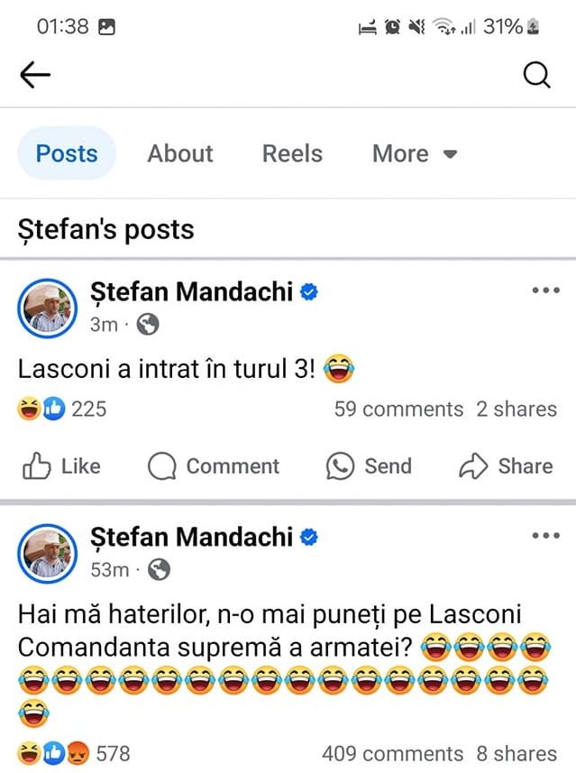 „Hai mă, haterilor (urâcioșilor), n-o mai puneți pe Lasconi comandanta supremă a armatei?” a fost prima postare publicată duminică de Mandachi pe Facebook, când Elena Lasconi încă se situa pe locul trei în urma numărării voturilor.