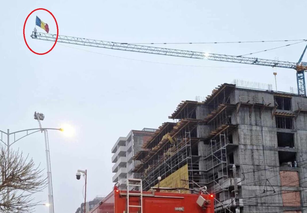 Fotografie de arhivă – Cezar Avrămuță, cunoscut sub numele de Stegarul Dac, s-a urcat pe o macara. Sursă foto: HotNews.ro