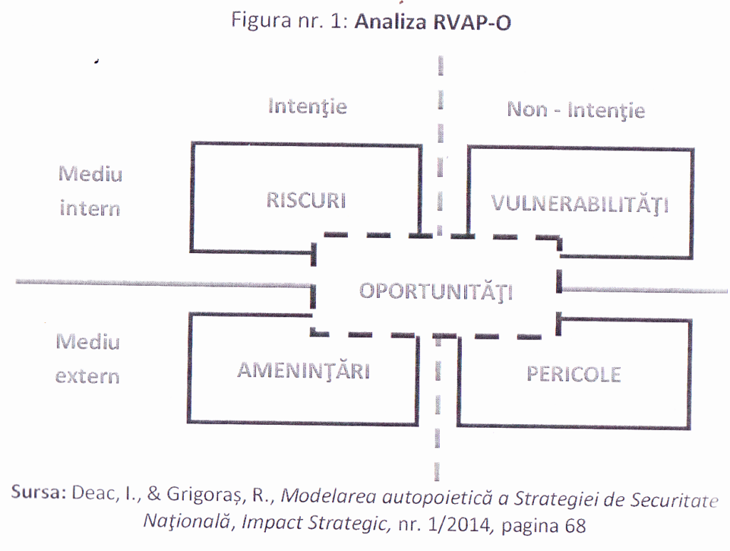 Săptămâna trecută am încercat să fac un punctaj al problemelor industriei energetice românesti. Metoda RAV (riscuri, amenințări, vulnerabilități) este cel mai des folosită. Eu prefer să folosesc o metodă de analiză care mi se pare mai completă. Această metodă (RVAP-O) a fost inițiată de Răzvan Grigoraș, lector universitar, doctor la Universitatea Națională de Apărare în cartea Risc și Oportunitate în Securitatea Națională. Pentru o înțelegere mai bună, redau schema acesteia.