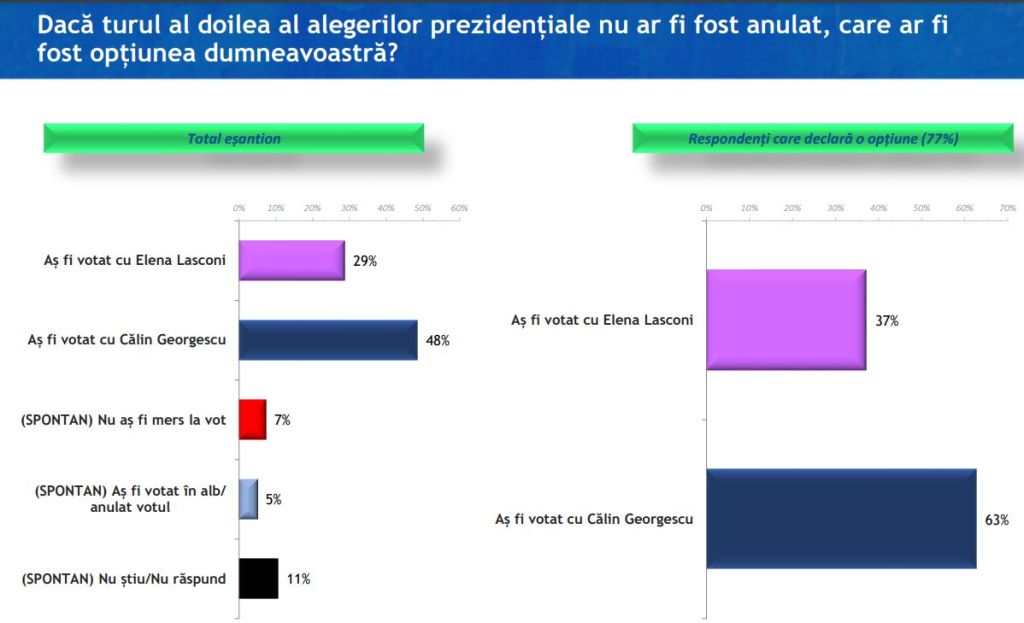 Întrebați care ar fi fost opțiunea lor de vot pentru turul al doilea alegerilor prezidențiale, în cazul în care turul întâi nu ar fiost anulat de CCR, 7% dintre cei chestionați spun că nu s-ar fi prezentat la urne, 5% declară că ar fi anulat votul sau ar fi votat în alb, iar unul din 10 respondenți nu știu ce ar fi făcut sau nu răspund. Alți 29% ar fi votat cu Elena Laconi, candidatul USR, în timp ce 48% i-ar fi dat votul candidatului independent Călin Georgescu.