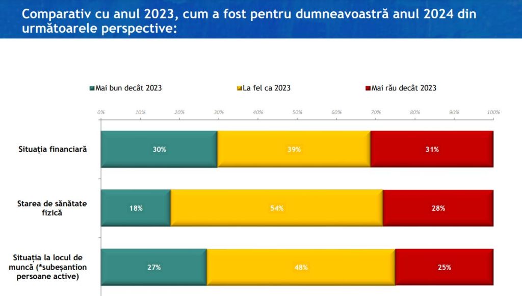 În ceea ce privește starea de sănătate, pentru mai bine de un sfert (28%) dintre respondenți 2024 a fost mai rău decât 2023. Au o percepție mai proastă asupra propriei stări de sănătate cu precădere femeile, respondenții cu vârste între 51 și 65 de ani, cei cu educație scăzută, care locuiesc în Moldova, care sunt de părere că România merge într-o direcție greșită, dar și votanții AUR.  Pentru jumătate (54%) dintre intervievați, din punctul de vedere al stării de sănătate, 2024 a fost la fel, iar pentru doar 18% a fost mai bun.