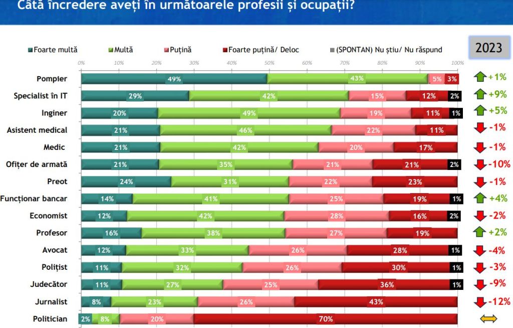 Românii îi plasează în topul încrederii pe ultimele poziții pe avocați (45%), pe polițiști (43%), pe judecători (38%) și pe jurnaliști (31%). Pe ultimul loc în topul încrederii se află, și în acest an, politicienii, doar unul din zece români are multă și foarte multă încredere în aceștia.