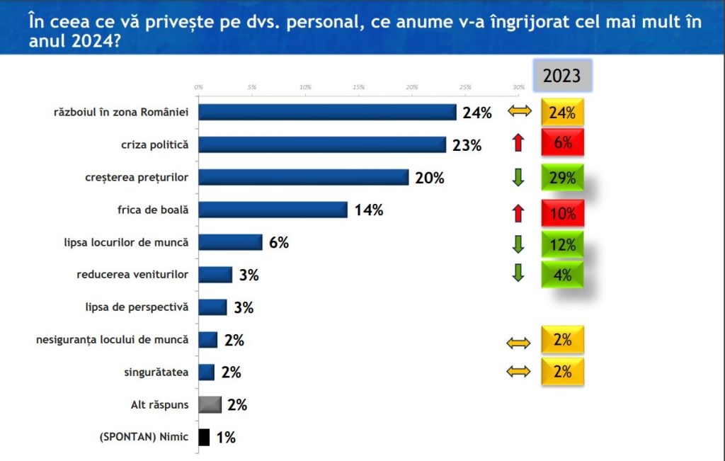 Războiul în zona României (24%), criza politică (23%) și creșterea prețurilor (20%) au fost principalele îngrijorări ale românilor în anul 2024.