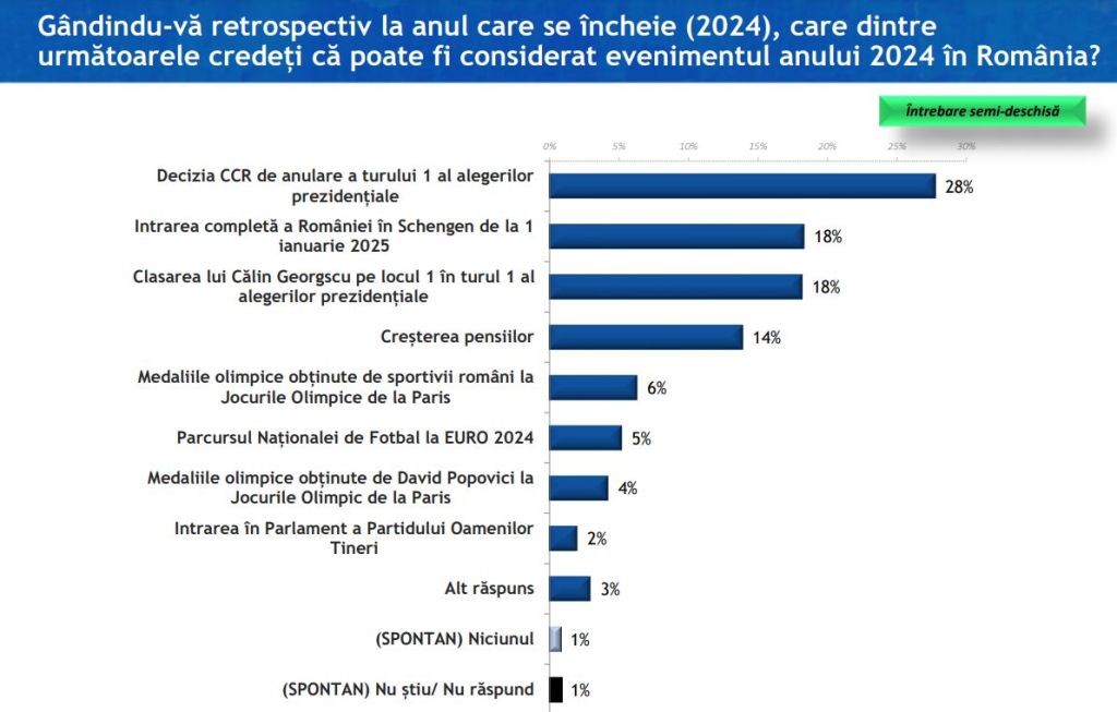 Decizia Curții Constituționale a României de a anula turul întâi al alegerilor prezidențiale este considerat de cei mai mulți dintre respondenți (28%) drept evenimentul anului în România. Intrarea completă a României în Schengen de la 1 ianuarie 2025 și clasarea lui Călin Georgescu pe locul  întâi în turul întâi al alegerilor prezidențiale sunt, la egalitate, indicate de câte 18% dintre participanții la sondaj.