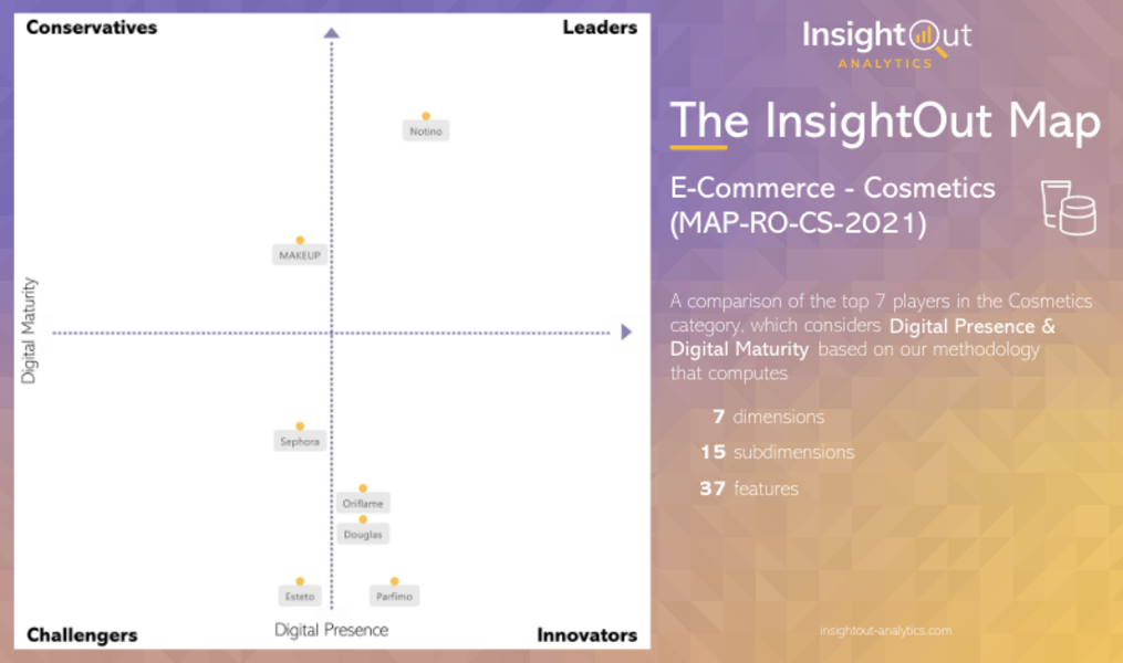 Potrivit Studiul InsightOut Map 2021, care analizează prezență digitală a peste 100 de magazine online, din cinci categorii mari de comerț electronic, Cosmetice este categoria cu cel mai puțin trafic din studiul pe 2021.