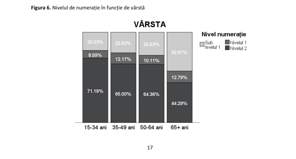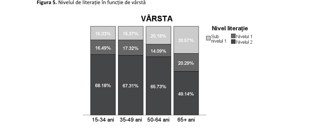 Cea mai slabă performanță o are grupa de vârstă 50–64 de ani, adică generația care avea între 15 și 30 de ani în momentul Revoluției din 1989. În rândul acestor persoane, 20,18% sunt analfabeți funcțional la literație, iar 14,08% sunt în zona de risc. Asta înseamnă că peste o treime dintre ei nu reușesc să înțeleagă informații simple din texte scrise.