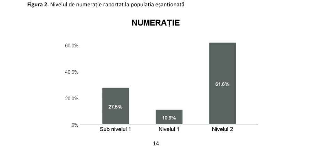 În cazul calculului, cifrele sunt chiar mai severe. 27,5% dintre respondenți nu au reușit să efectueze nici măcar operații aritmetice de bază. Alți 10,9% se încadrează într-o zonă de risc, în care pot face calcule simple, dar nu înțeleg proporții sau procente elementare. Doar 61,6% dintre adulți se descurcă bine atunci când vine vorba de competențe numerice.