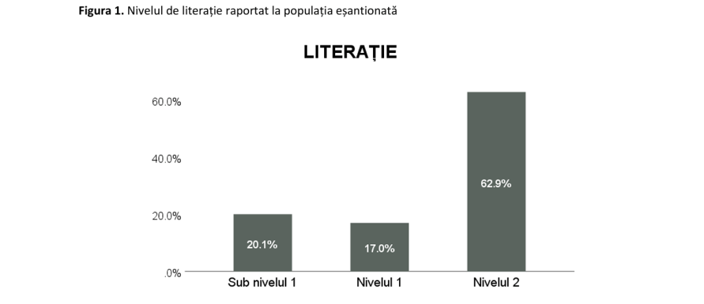 În cazul literației, 20,1% dintre adulți nu au reușit să treacă de cel mai de bază nivel de competență. Asta înseamnă că nu pot localiza o informație simplă într-un text scurt sau nu recunosc vocabularul de bază. Alte 17% dintre persoane se află într-o zonă de risc – reușesc să înțeleagă texte ușor mai complexe, dar cu dificultate. Doar 62,9% dintre românii adulți ating un nivel considerat adecvat pentru viața de zi cu zi.