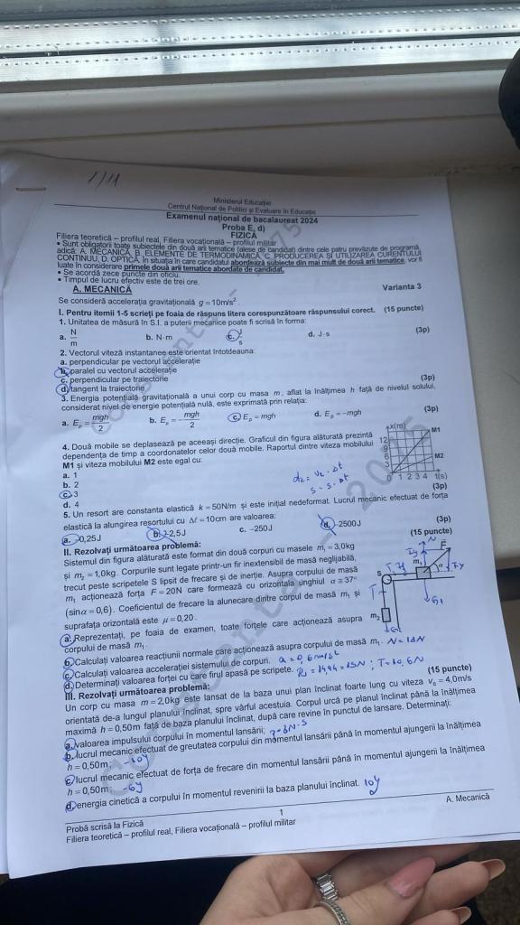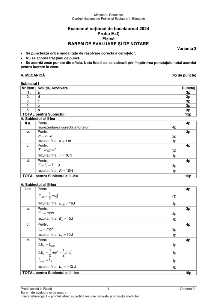 Barem de rezolvare subiecte Fizică BAC 2024 – Mecanică