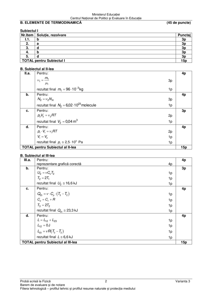 Barem de rezolvare subiecte Fizică BAC 2024 – Termodinamică