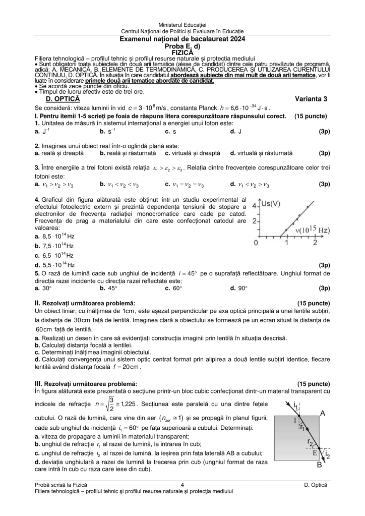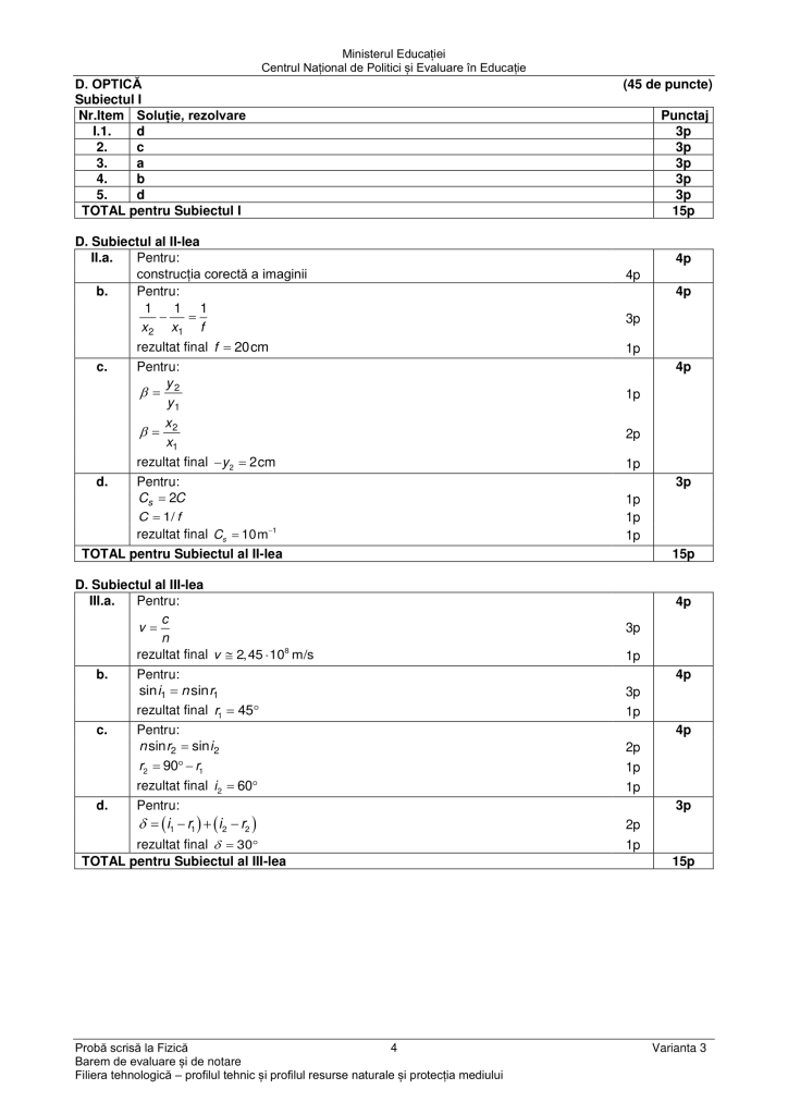 Barem de rezolvare subiecte Fizică BAC 2024 – Optică