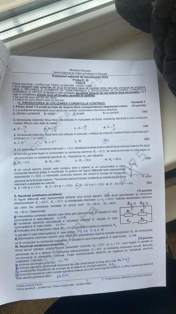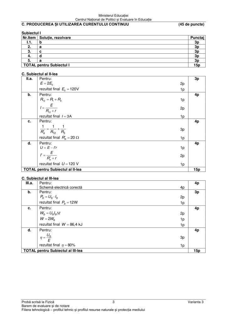 Barem de rezolvare subiecte Fizică BAC 2024 – Curentul continuu
