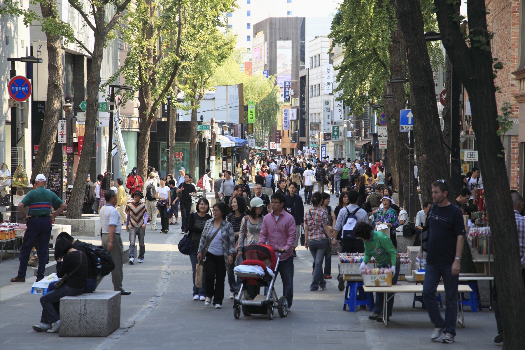 Oameni la plimbare pe o strada din SeulFoto: Wendy Connett / robertharding / Profimedia Images