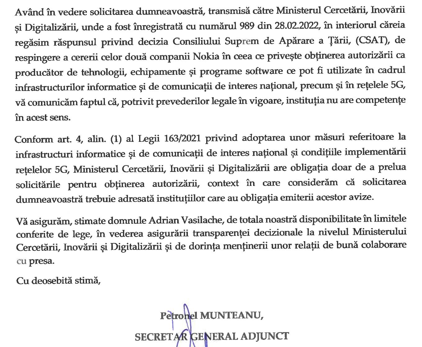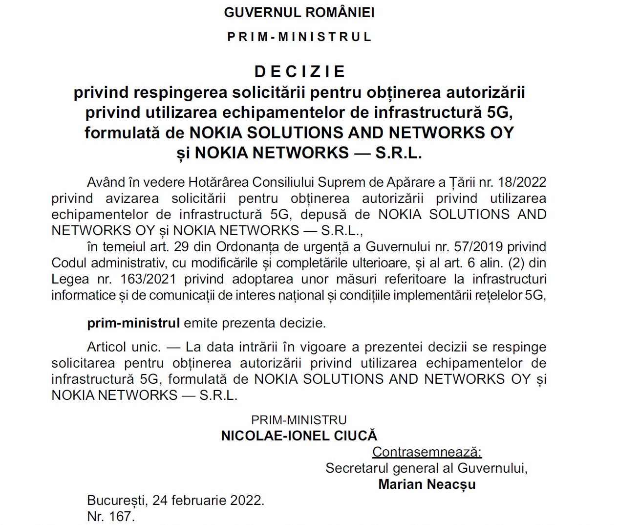 HotNews.ro a scris în premieră în luna martie din acest an că două companii membre ale grupului finlandez Nokia au dat în judecată Guvernul României după ce nu au obținut autorizarea CSAT pentru a utiliza echipamente de infrastructură 5G în rețelele de comunicații din țară. Nokia este unul dintre cei mai mari producători de echipamente și soluții 5G alături de Huawei și Ericsson, iar Guvernul nu și-a motivat acest refuz.