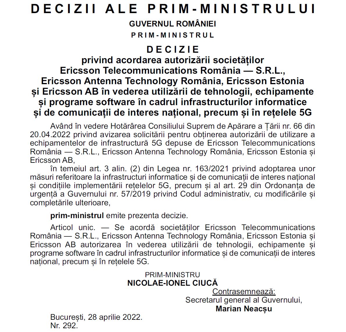 Hotărârea CSAT emisă în acest an nu este motivată, dar pe baza acesteia premierul Nicolae Ciucă a semnat joi o decizie publicată acum în Monitorul Oficial, care va împiedica cele două companii să participe pe viitor în construcția rețelelor 5G din România.
