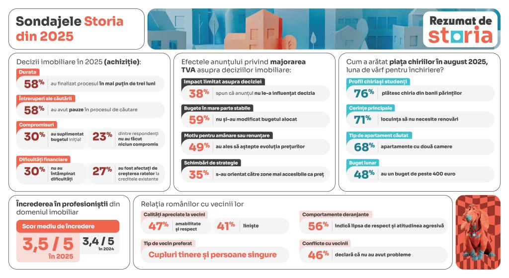 În 2025, Storia – cea mai vizitată platformă imobiliară din România, a desfășurat mai multe sondaje și analize, din care se conturează o serie de informații-cheie relevante pentru piața imobiliară. Sondajele și analizele au acoperit teme precum deciziile imobiliare privind achiziția unei locuințe, impactul majorării TVA, relația românilor cu vecinii, precum și accesibilitatea locuințelor de închiriat și de vânzare sau nivelurile salariale minime necesare pentru a cumpăra ori închiria o proprietate de lux.