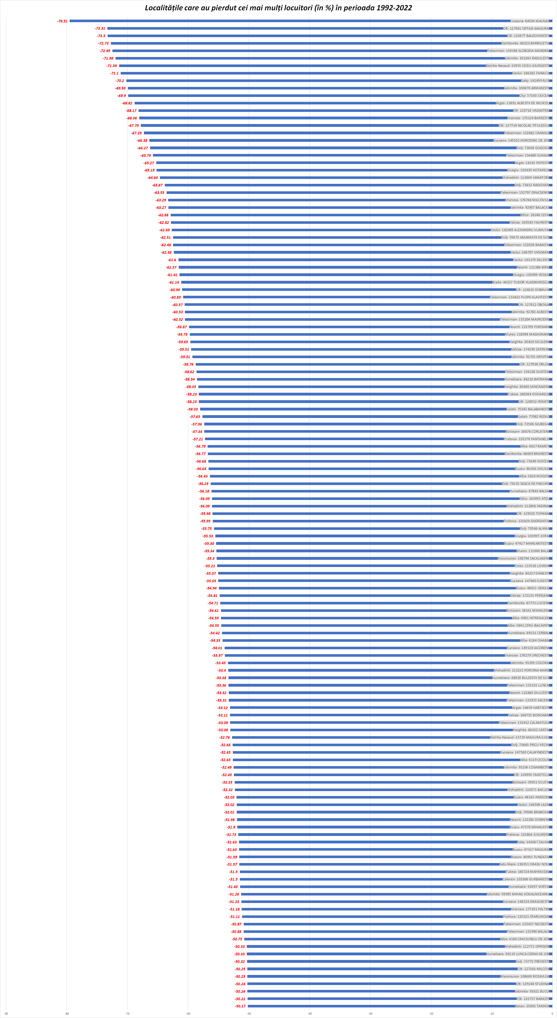 Primele 100 de localități din topul de mai sus au pierdut echivalentul populației unui județ mai modest ( de circa 300.000 de locuitori).