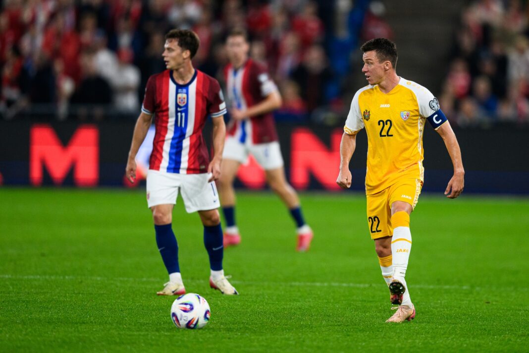 Vadim Rață, în timpul meciului de fotbal din preliminariile Cupei Mondiale FIFA dintre Norvegia și Republica Moldova, pe 9 septembrie 2025, la Oslo.