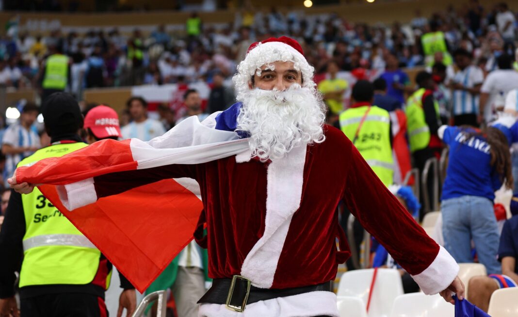 Fotografie ilustrativă – Suporter al naționalei Franței, costumat în Moș Crăciun în timpul meciului de la Cupa Mondială FIFA 2022 disputat pe stadionul Lusail, Doha.