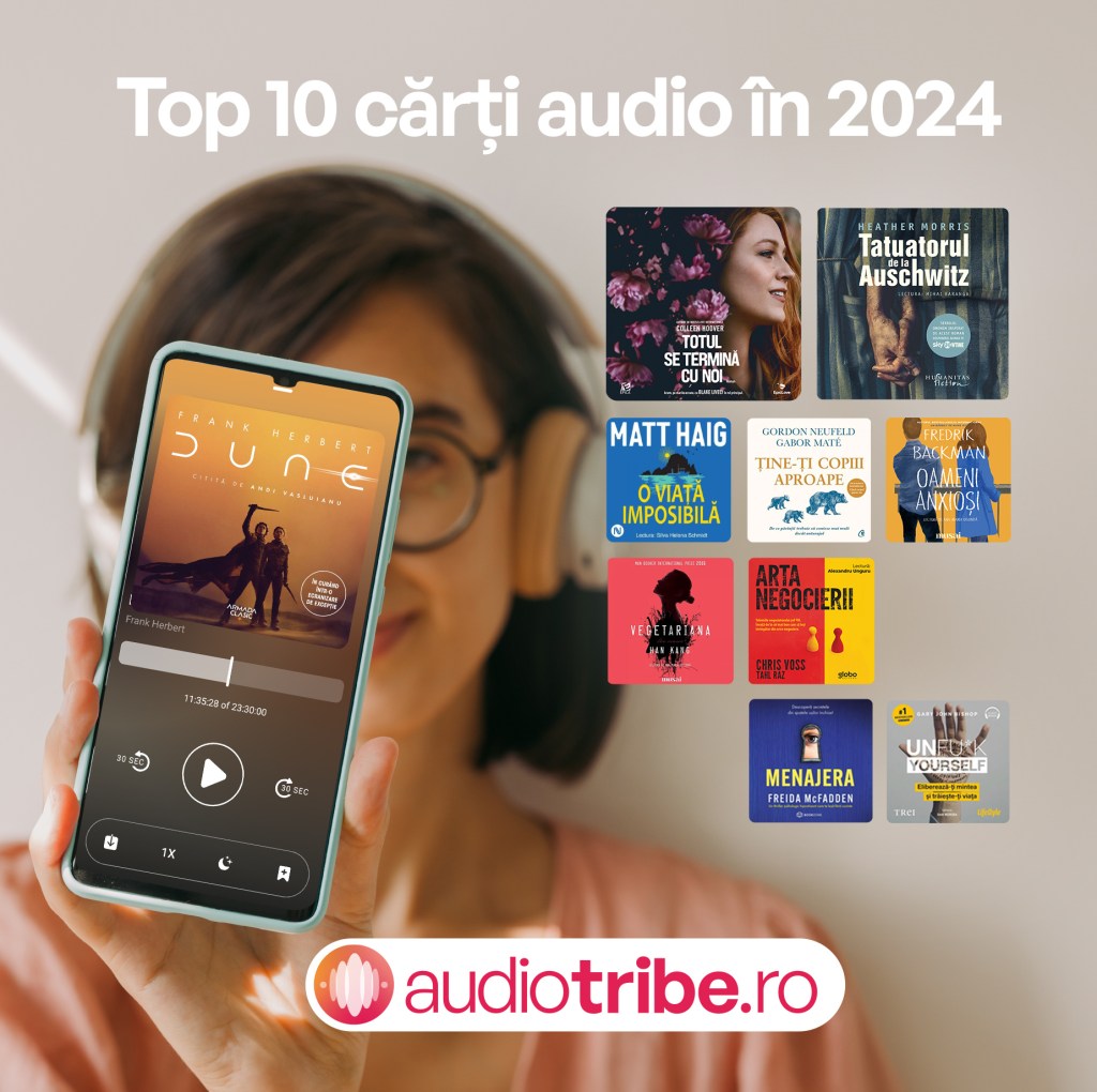 „2024 este evident un an record pentru cărțile audio, cu un profil din ce în ce mai variat de ascultători încurajați de posibilitatea de a asculta și a citi oricâte cărți în cadrul abonamentului, dar și de oferta din ce în ce mai mare de titluri. Încheiem un an în care am crescut businessul atât în cifra de afaceri, cât și în numărul de cărți ascultate care aproape s-a dublat. Dar surpriza a fost să vedem o schimbare la nivel de trenduri pe care nu puteam să o anticipăm. A fost aceeași concluzie cu cea a celui mai mare târg de carte din lume – Târgul de carte de la Frankfurt”, spune Radu Nicolau, directorul general al AudioTribe, prima platformă românească de cărți audio.