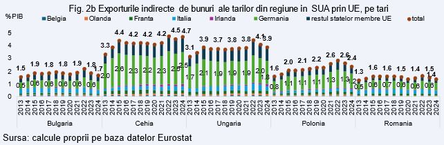 În perioada 2013-2024, aceste șase țări au intermediat exporturile indirecte de bunuri ale țărilor din regiune în SUA în proporție de 80% în România, Cehia și Polonia și circa 70% în Bulgaria și Ungaria (Fig. 2b). În 2024 proporția exporturilor indirecte de bunuri către SUA intermediată de Germania a fost de 39% în Bulgaria, 41% în România, 47% în Ungaria, 50% în Polonia și 54% în Cehia. Italia a intermediat 19% respectiv 18% din exporturile indirecte ale României și Bulgariei, 10% din exporturile indirecte ale Ungariei și 7% respectiv 8% din exporturile indirecte ale Cehiei și Poloniei.