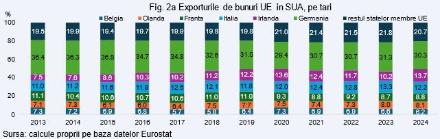 Filierele din UE prin care exporturile indirecte ale țărilor din regiune sunt intermediate către SUA sunt în principal țările membre UE care au cele mai mari exporturi directe către SUA. În perioada 2013-2024, șase state membre UE generau aproape 80% din exportul UE de bunuri în SUA. Germania a rămas cea mai mare exportatoare de bunuri către SUA din UE, cu toate că ponderea exporturilor sale în total exporturi UE către SUA a scăzut de la 36,4% în 2013 la 30,3% în 2024 (Fig. 2a).