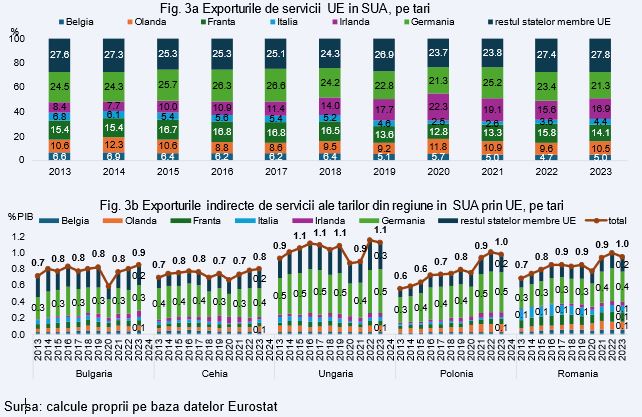 În 2023, Germania a intermediat cea mai mare proporție a exporturilor indirecte de servicii ale regiunii către SUA (37% în Bulgaria, 38% în România, 44% în Cehia, 47% în Ungaria și 49% în Polonia). Al doilea cel mai mare intermediator al exporturilor indirecte de servicii către SUA a fost Irlanda pentru Bulgaria (10% din exporturile indirecte), Olanda pentru Cehia (7% din exporturile indirecte), Ungaria (7% din exporturile indirecte) și Polonia (10% din exporturile indirecte) și Franța pentru România (12% din exporturile indirecte).